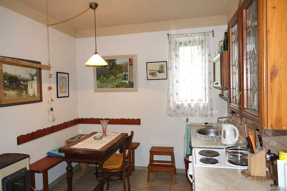 V objektu jsou osazena dřevěná i plastová okna, vytápění je řešeno lokálně na tuhá paliva, ohřev teplé vody je el. ohřívačem, voda je zavedena z obecního vodovodu, na pozemku i vlastní studna, WC řešeno chemickým WC. Střecha RD je sedlová, kompletně nově realizovaná včetně krovu, střešní krytina Bramac. Na objekt z levé strany navazuje garáž, z pravé strany prostory vhodné k dobudování koupelny a WC.